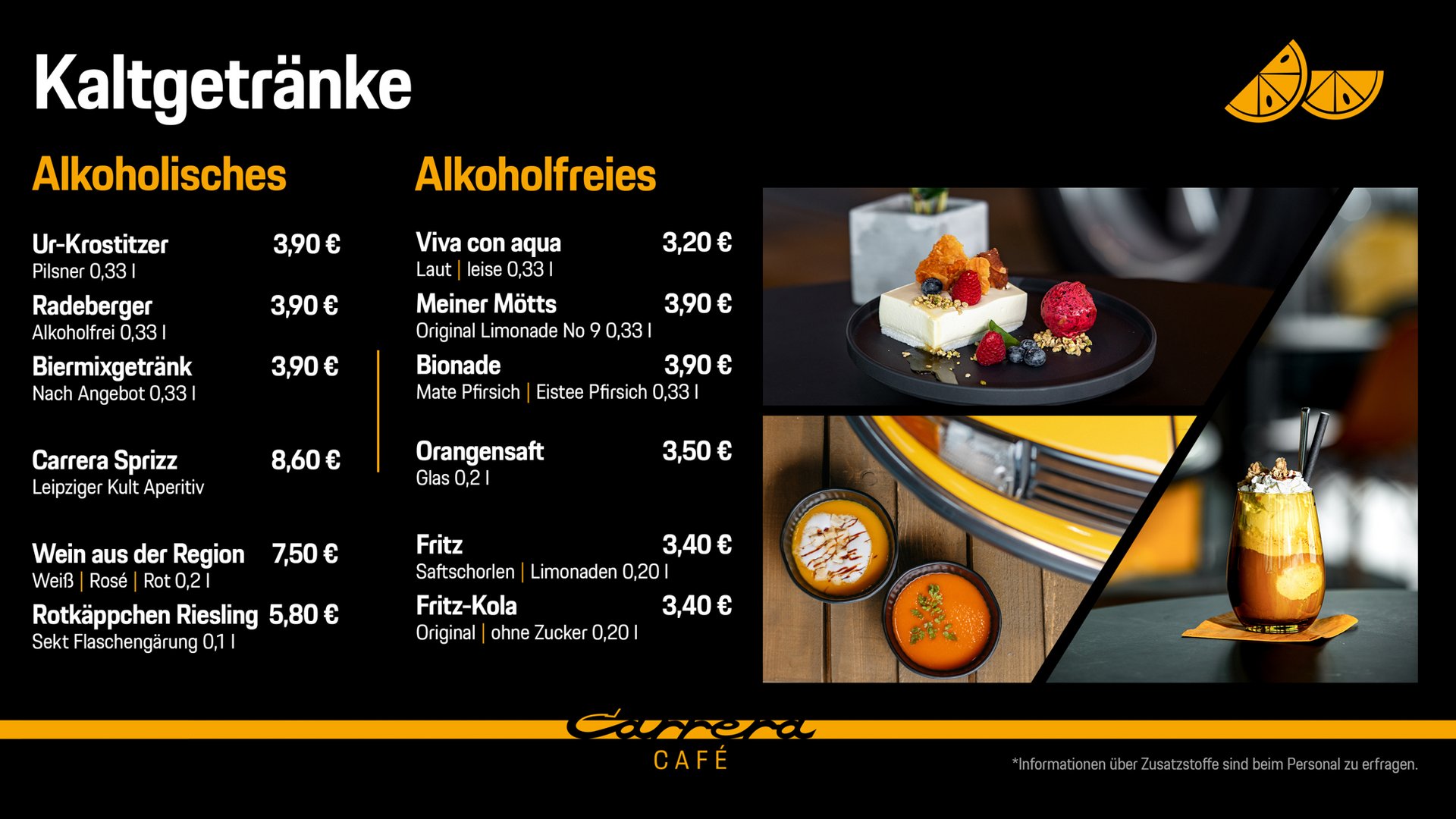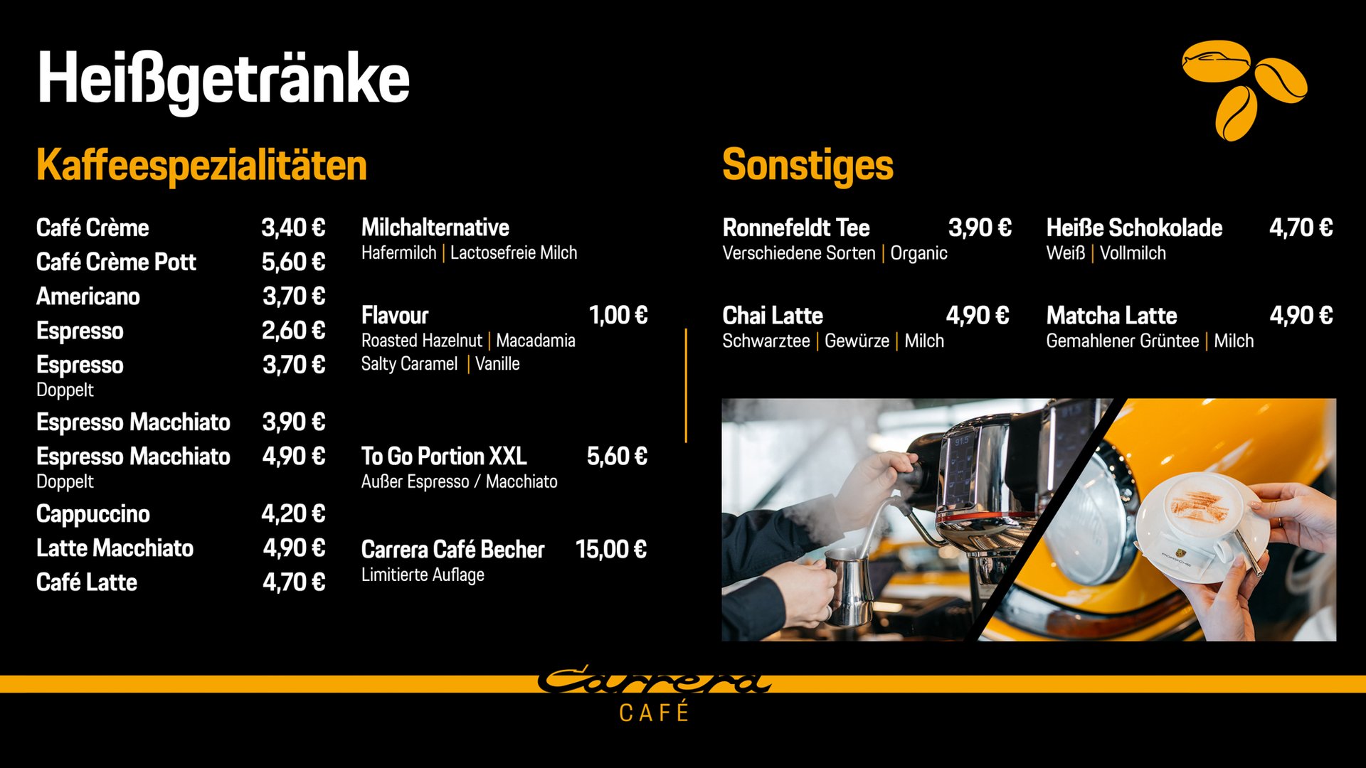 Im Carrera Café steht Ihnen ein vielseitiges Snackangebot aus saisonalen herzhaften und süßen Speisen bereit, dazu gibt es eine Vielzahl an Kaffeespezialitäten. Beginnen Sie den Tag mit unserem Carrera Frühstück oder lassen Sie sich von den wechselnden Wochenangeboten unserer hauseigenen Gastronomie überraschen. Bei uns kommen Augen und Gaumen auf ihre Kosten. Nehmen Sie sich Zeit für Ihr ganz persönliches Porsche Erlebnis. Ein Boxenstopp ganz nach Porsche Art.