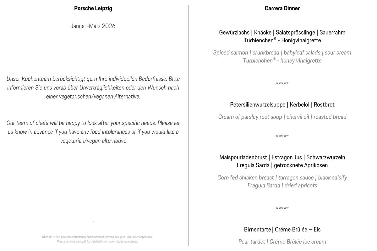Unser Carrera Dinner ist das ideale Angebot für bedeutende private Anlässe oder exklusive Firmenfeiern. Im beeindruckenden Ambiente des Porsche Experience Center Leipzig verwöhnen wir Sie mit einem Abendessen der Extraklasse.