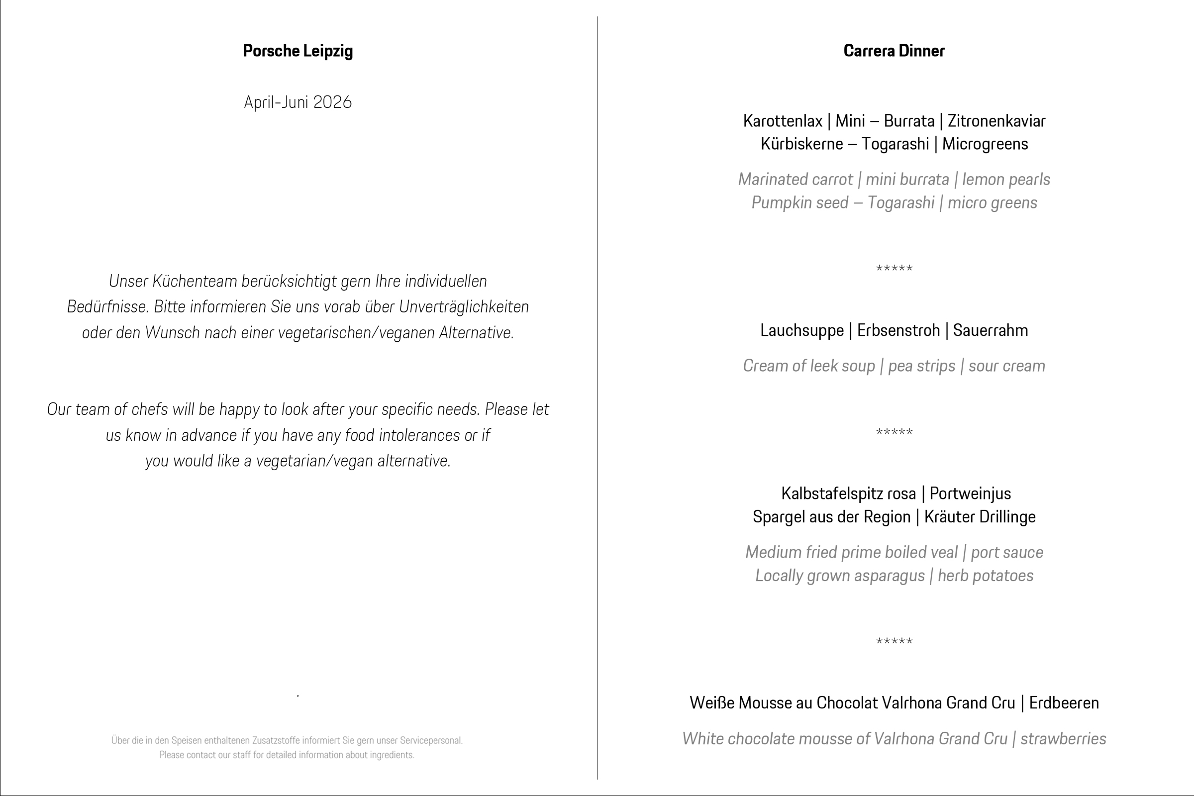 Dabei werden Sie nicht nur von unserem erstklassigen 4-Gang-Menü verwöhnt, sondern können das Dinner in unserem hauseigenen Restaurant bei einem faszinierenden 360°-Blick auf unser Porsche Gelände und die Rundstrecke genießen. Wie wäre es zum Beispiel mit Tatar vom Leipziger Auerochsen, dazu gebackene Kapern mit Kartoffelcroutons? Wein, Bier und eine Auswahl alkoholfreier Getränke sind bei diesem Angebot inklusive.