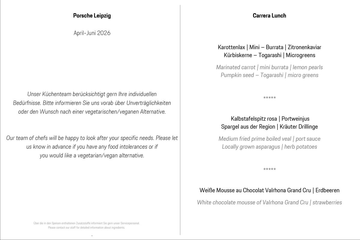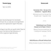 In unserem Restaurant bieten wir Ihnen Kochkunst à la Porsche. Genießen Sie ein 3-Gang-Menü im exklusiven Ambiente des Porsche Experience Center Leipzig. Es erwarten Sie z. B. Esskastaniensuppe, Oldenburger Ente und ein gebratenes Apfeltörtchen. Dabei genießen Sie nicht nur Ihr Menü, sondern auch den faszinierenden 360°-Blick.