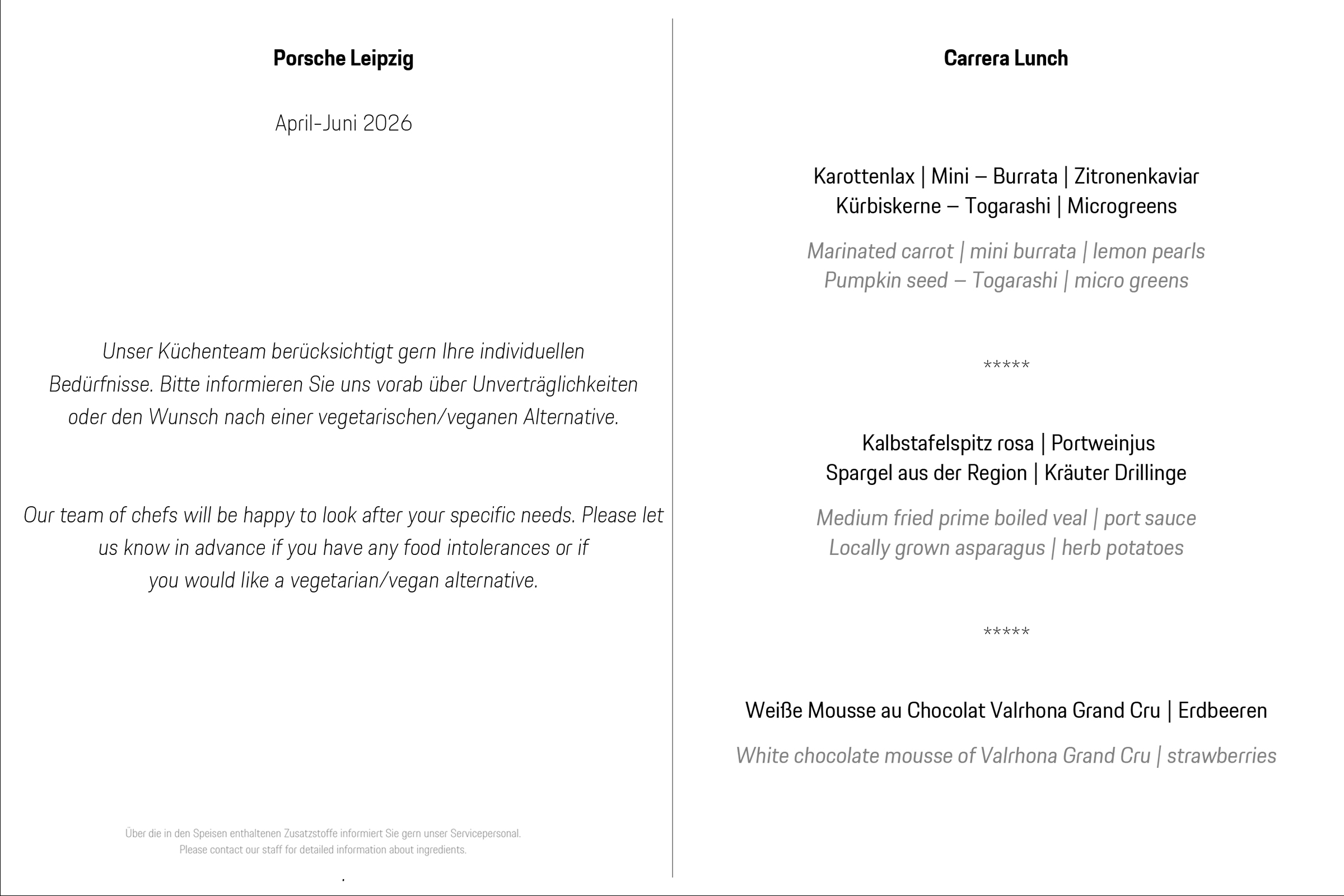 - Unser Küchenteam berücksichtigt gern Ihre individuellen Bedürfnisse. Bitte informieren Sie uns vorab über Unverträglichkeiten oder den Wunsch nach einer vegetarischen/veganen Alternative.