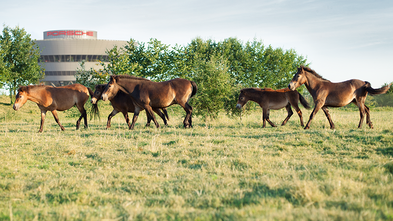 Bei Porsche Leipzig wird der Schutz der Natur gelebt – mit einem außergewöhnlichen Beweidungskonzept. Sicher abgetrennt von der eigentlichen Geländestrecke leben Wildpferde und Auerochsen in einem ökologischen Kleinod.